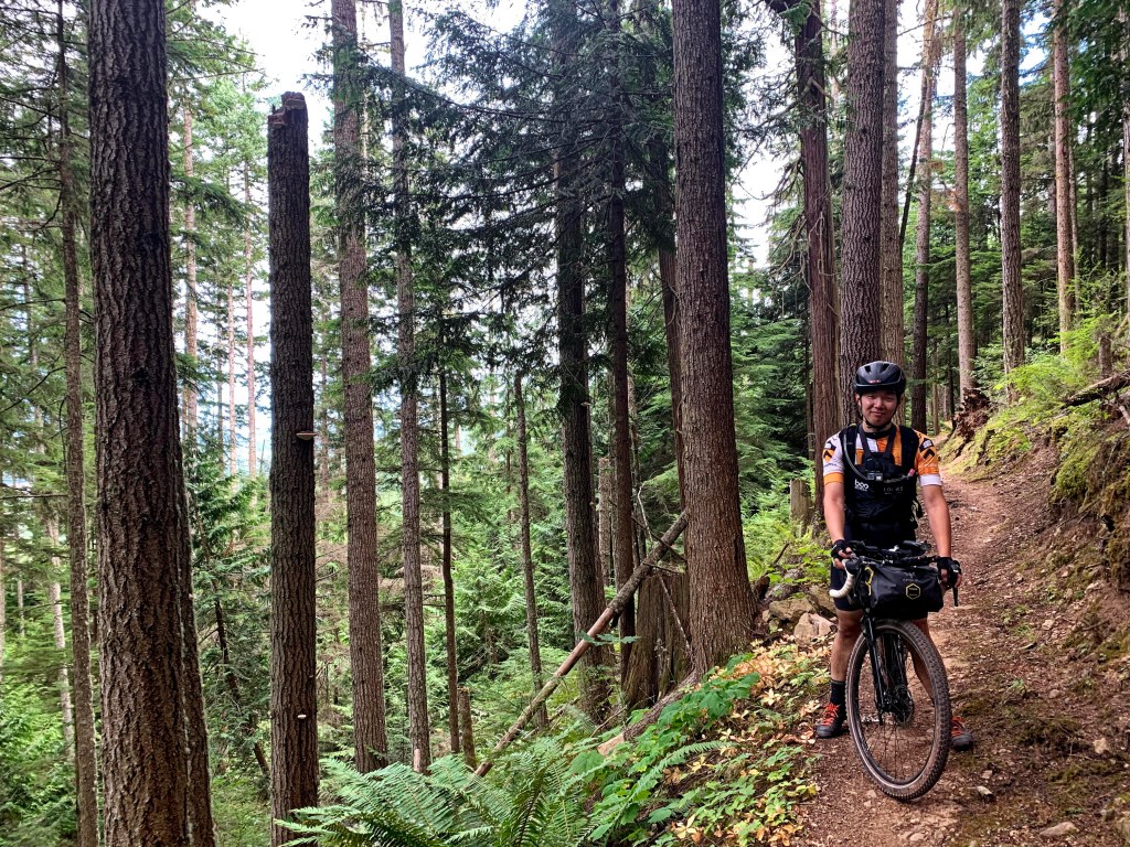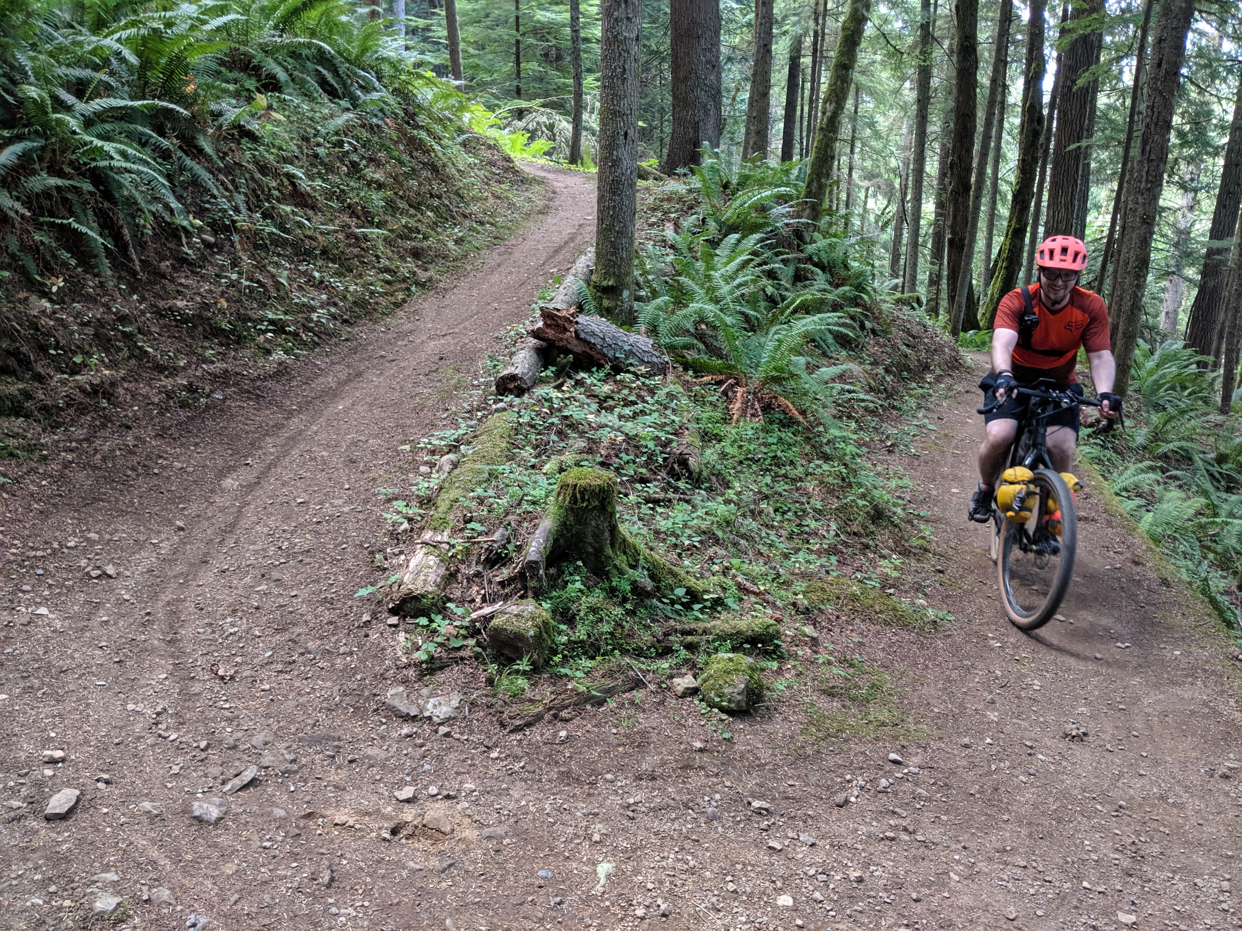 Mountain biking differs from road cycling in a number of ways: for road cycling, the challenges in bike handling come from the speed (the fastest I’ve been on a bike is 96 kph / 60 mph, but pros can hit up to 120 kph); in mountain biking, navigating features and going through loose surfaces is what causes trouble. Road cyclists endure pain for long climbs and are good at putting out an incredibly consistent effort; mountain bikers put out a ton of power in short bursts to clear obstacles and steep climbs. Road cyclists look like the human equivalent of a T-Rex (huge legs, no upper body muscles) tightly wrapped in lycra; mountain bikers wear loose shorts and actually have upper body muscles. I was a spandex-wearing, leg-shaving, aero-bike riding roadie through and through, and I would be totally out of my element on this singletrack, even with the 650B mountain bike tires I was using on my gravel bike. Fortunately, I had a seasoned mountain biker with me to lead the way.