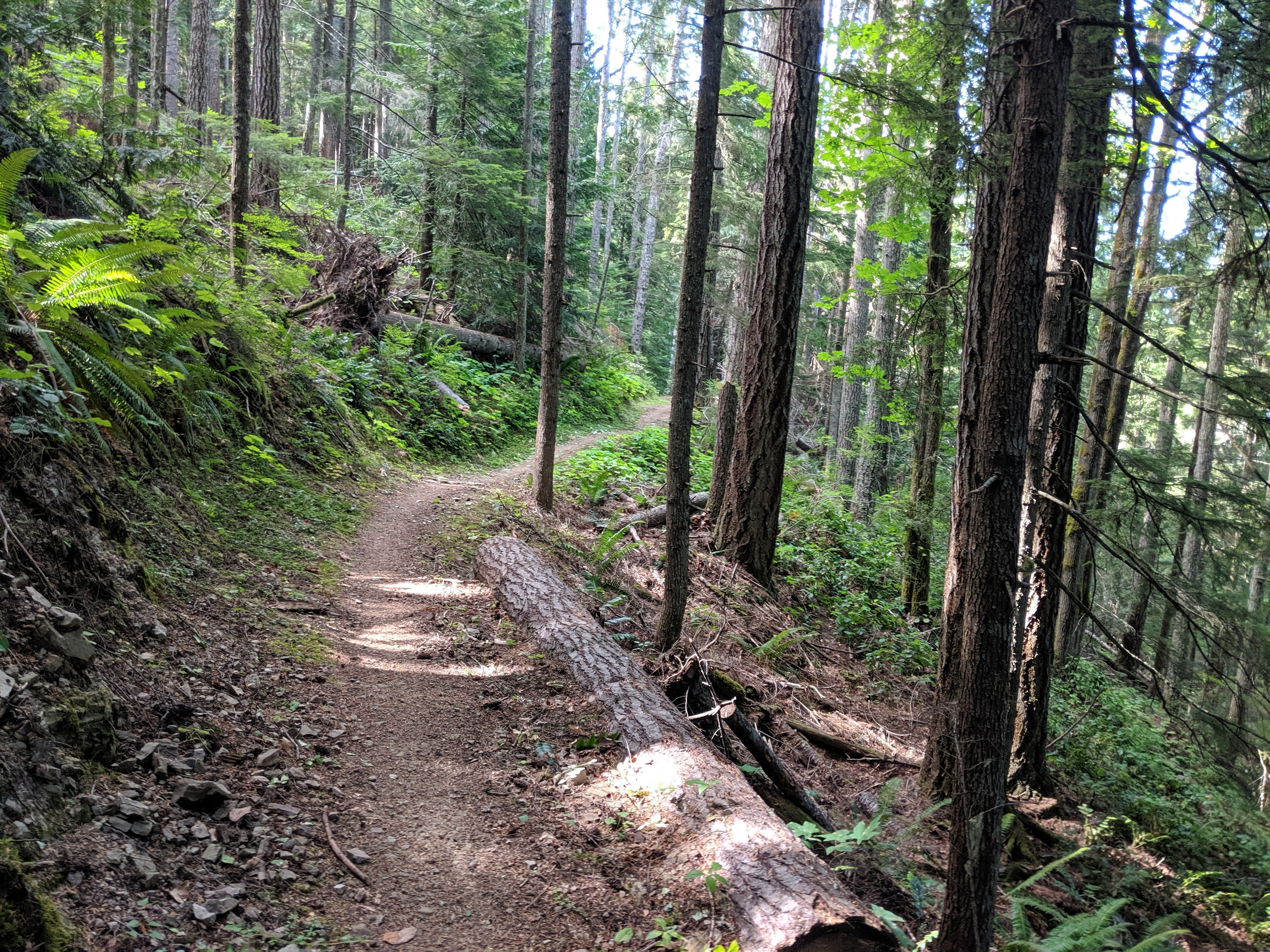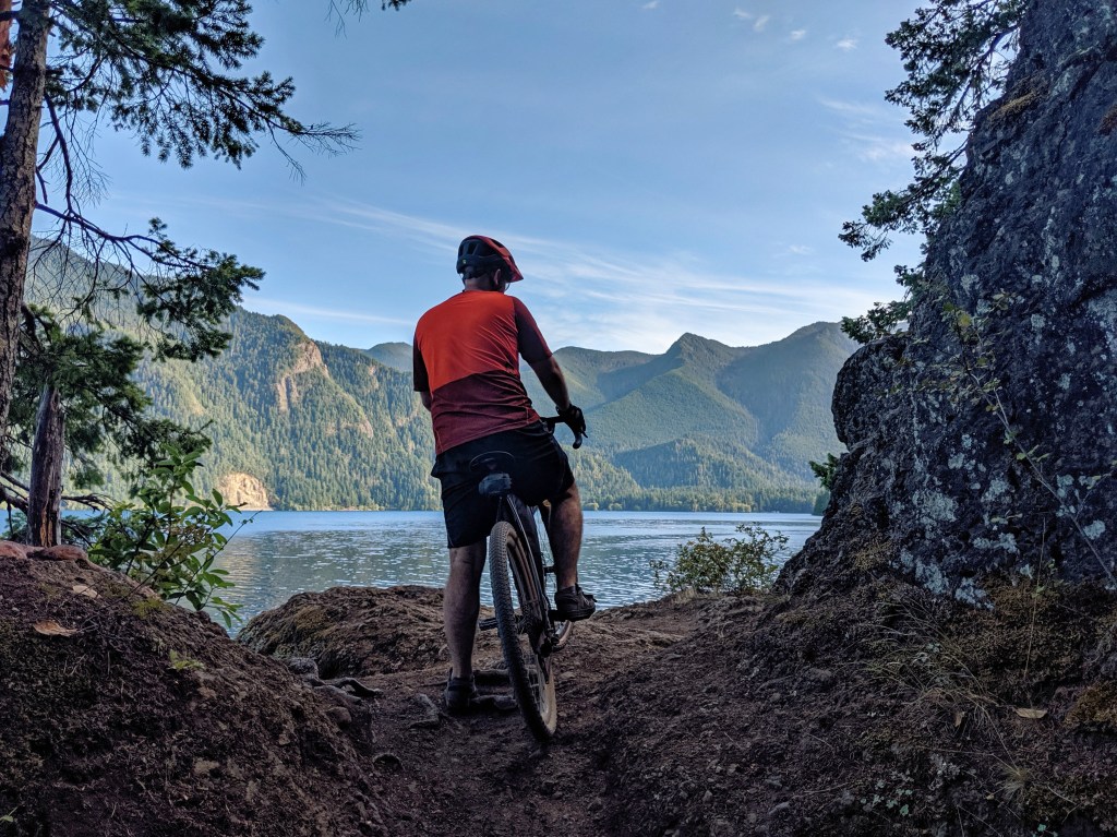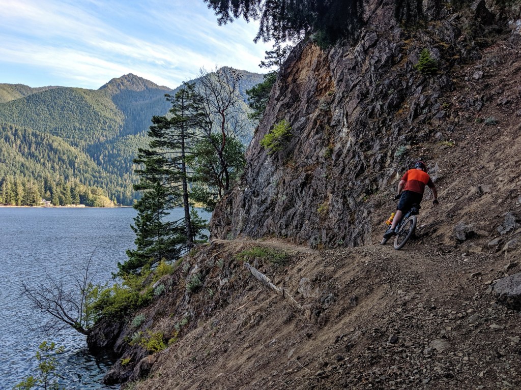 The pavement turned back into gravel, and gravel back into singletrack as we headed west along the shore. Lake Crescent was simply stunning in the late afternoon sun — being a glacial lake, the fine glacial silt particles suspended in the water scattered light (I’m not sure if the silt falls under Rayleigh scattering regime) in ways that pure water doesn’t, and imbued the lake with an ethereal azure hue that has to be seen to be believed.
