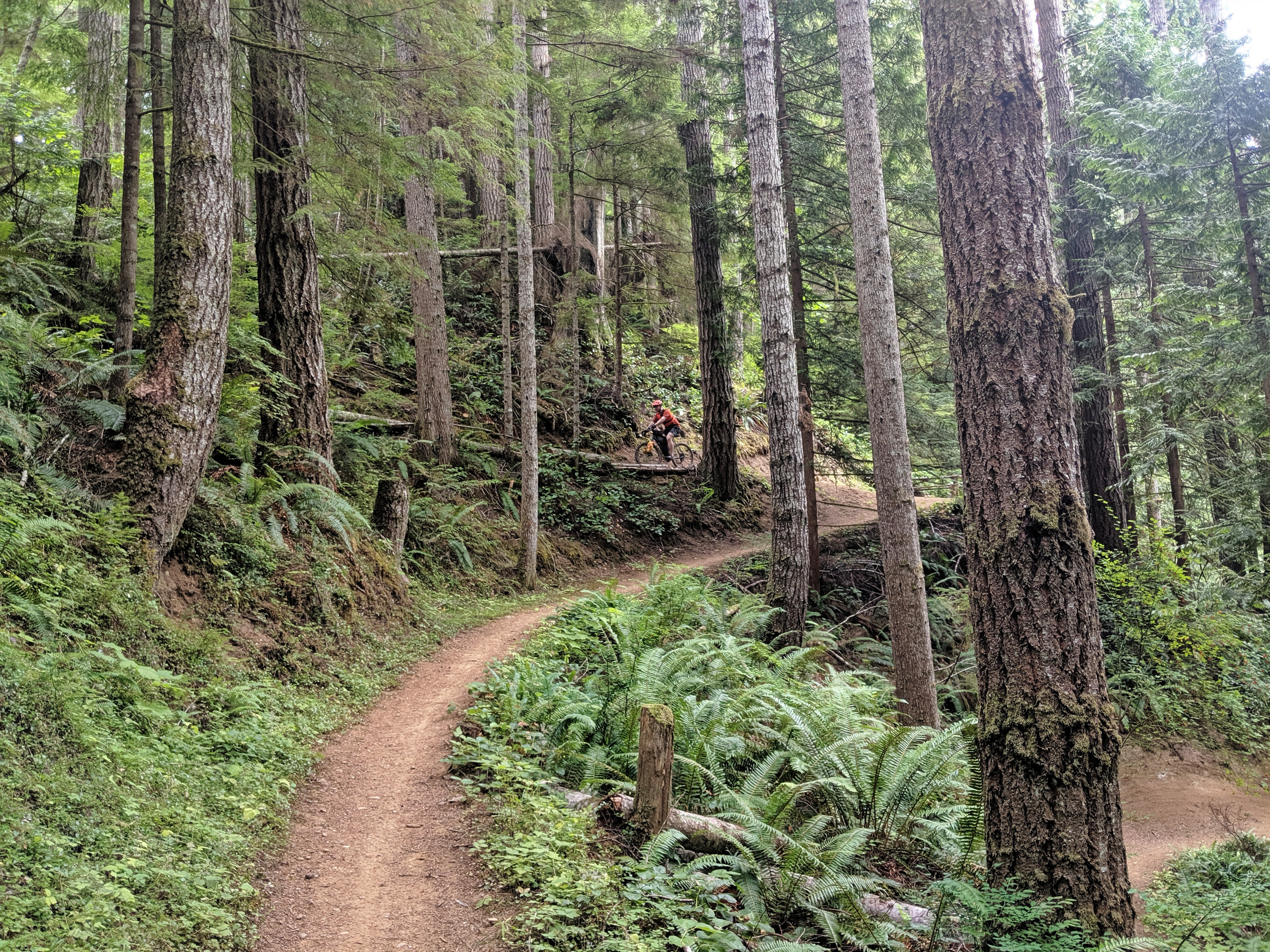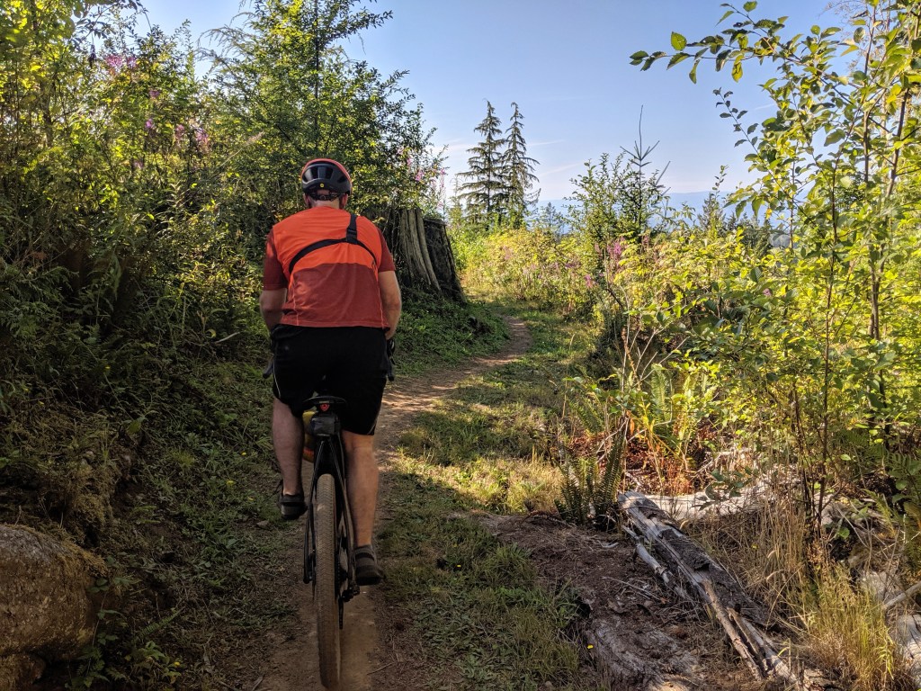 As we went deeper into the trail, I became very grateful that I fell where I did and not anywhere else. The trail was cut into the side of the mountain through the ferns and the evergreens; just to our right was a ten-plus metre drop into the ravine. On the faster downhill sections, I wondered what Nathan — who was far ahead of me — would even do if he saw a rider coming the other way. In some sections, two riders could hardly pass each other even if one was standing, and there was nowhere you could go to avoid someone showing up around a blind corner. Fortunately we didn’t have to find out.