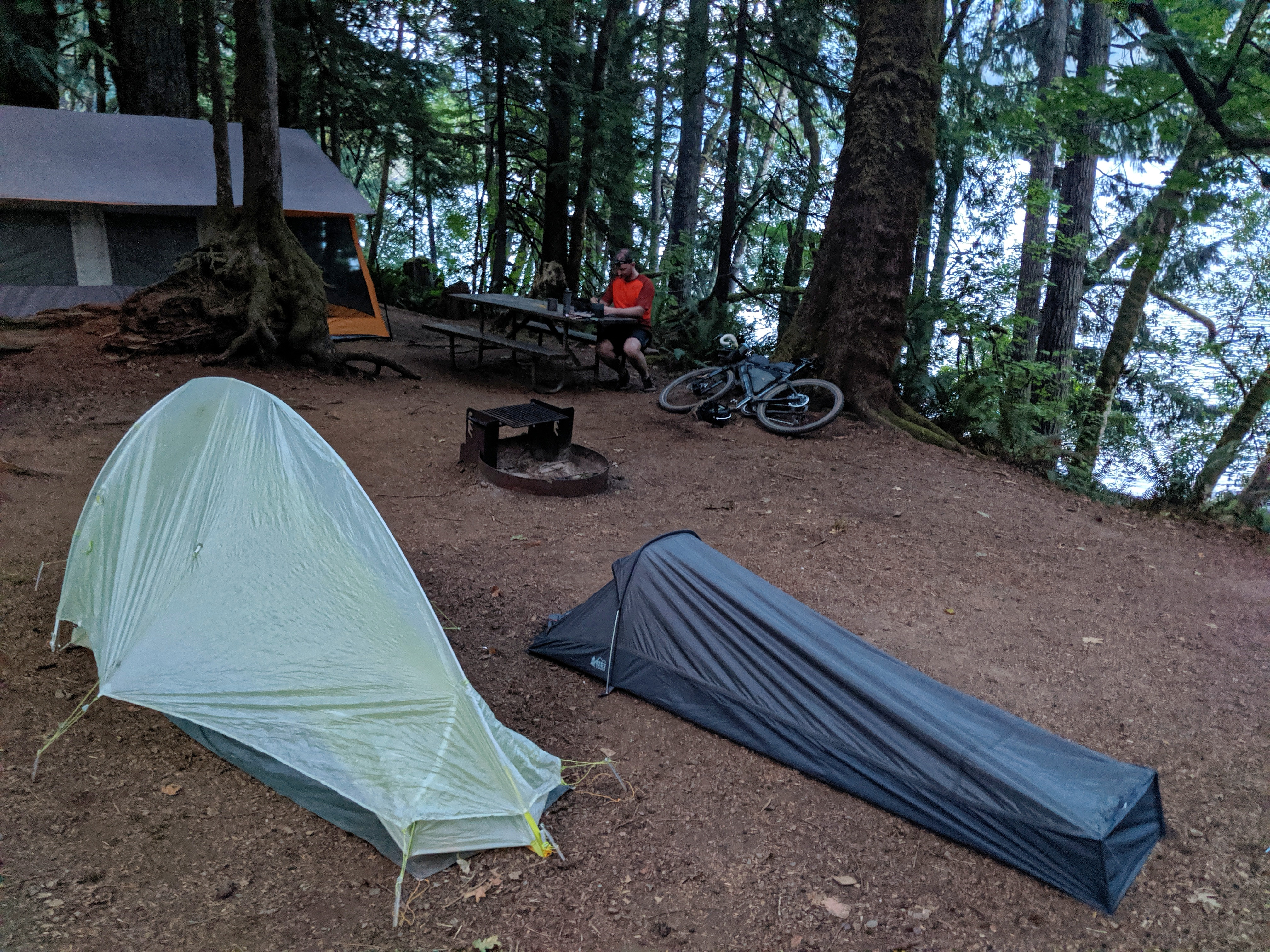 One of the great magics of bikepacking (and cycle touring) is how accessible people are when you’re on a loaded bicycle. You’re very clearly not a threat; you’re signalling openness; you’re vulnerable; you’re likely foreign; you’re doing something interesting. All of these things bring out the best qualities in people (more on that in the next part), and people want to talk to you. They want to know what you’re doing, where you’re from, where you’re going, if you need help, and so on. Add the usual solidarity between cyclists, and it’s not a surprise that cycle tourists / bikepackers get along so well with each other. We were headed to the same campsite, so Nathan and I decided to follow Quinn and his cousin Frankie — they looked like they knew what they were doing. And as it turned out, they certainly did. (Immutable truth: anybody who has a jar of peanut butter in a water bottle cage knows what they’re doing.) They had biked to the northwesternly extreme of the contiguous United States from none other than northern New Jersey over four months, and this was the final part of their trip. And furthermore, they were the very same cycle tourists that we’d seen lugging up Hurricane Ridge that morning.