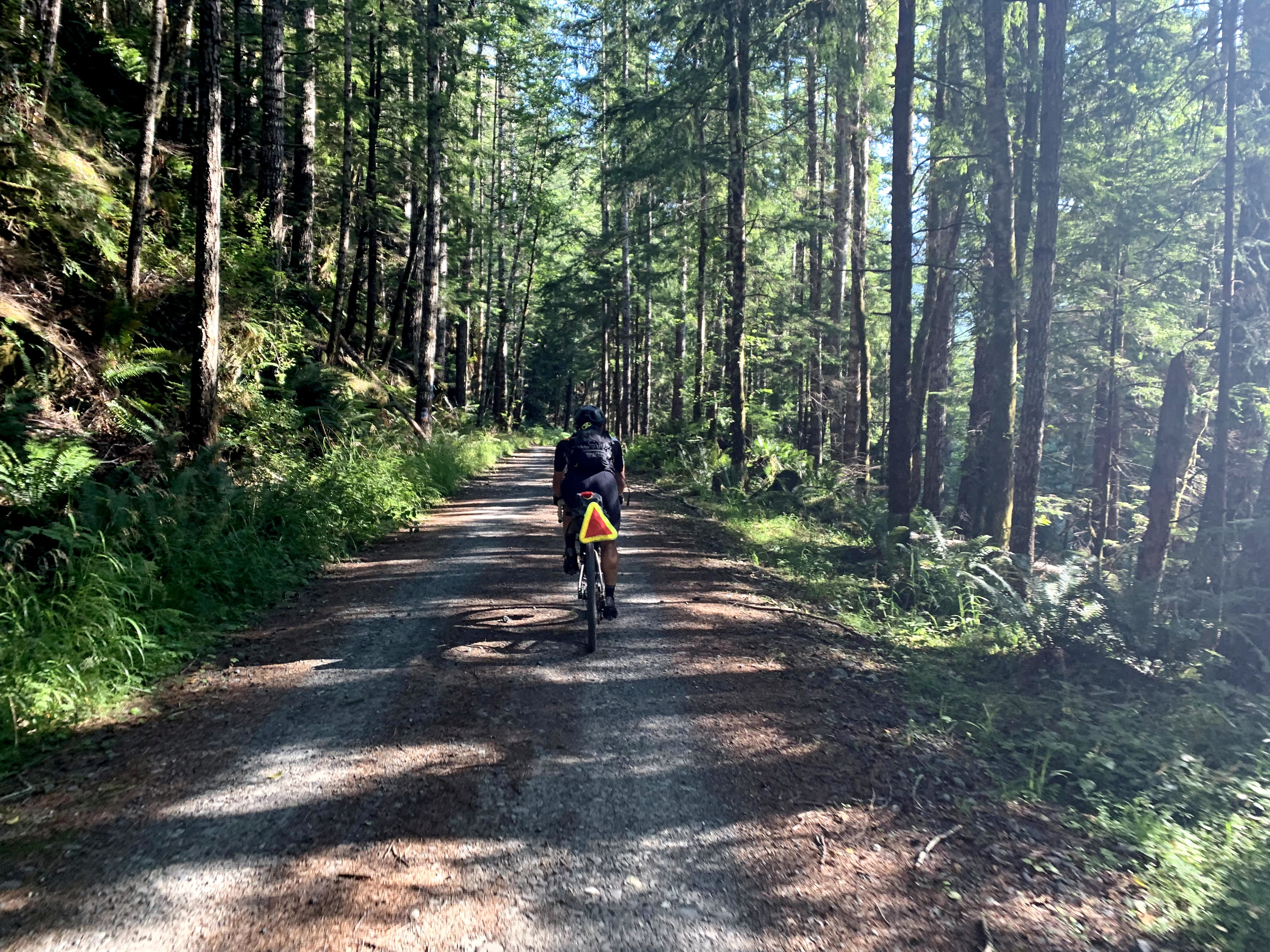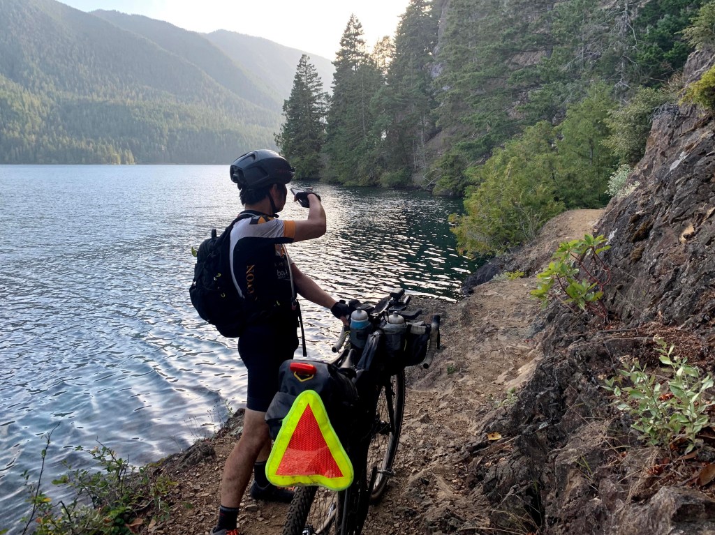 We finally reached the gravel road and I was back in my comfort zone, happy to use my aerobars. When we came onto the pavement from the gravel, we took a wrong turn onto what looked like a path and ended up on the shore of Lake Crescent — and ended up bumping into the couple from the previous day who were camping in the campsite next to us. They’d decided to stealth camp there, and had done the same trail as us on hybrid bikes. Having wished them a pleasant evening, we set out towards our campsite, which was still 15 km or so away.